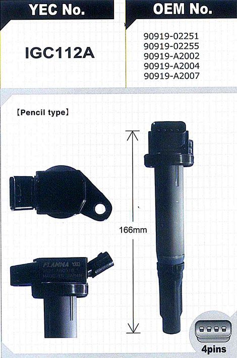 Катушка зажигания / YEC для Toyota Alphard Estima Harrier Mark X RX270/350/450H Camry -2011 RAV4 Blade; H=166mm; IGC112A; (90919-A2002 TYDI-3004E TG-90919-02255) 9091902251