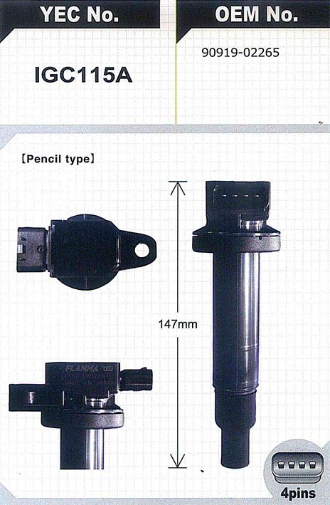 Катушка зажигания / YEC для Toyota Vitz 2010-2012 Corolla Axio Fielder 2013- Prius Probox Succeed 2010- NCP59G; H=147mm; IGC115A; (TG-90919-02240 IGC103A ) 9091902265 4809580565